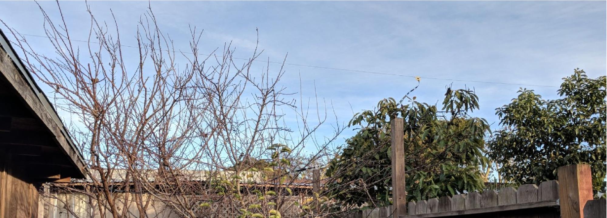 The full run was about 240ft, with the antenna strung between rope on ceremic insulators. It was tied off to a TV satellite dish on the north end of the roof, and threaded through a pulley in the tree to a hanging cinderblock counterweight on the south end.